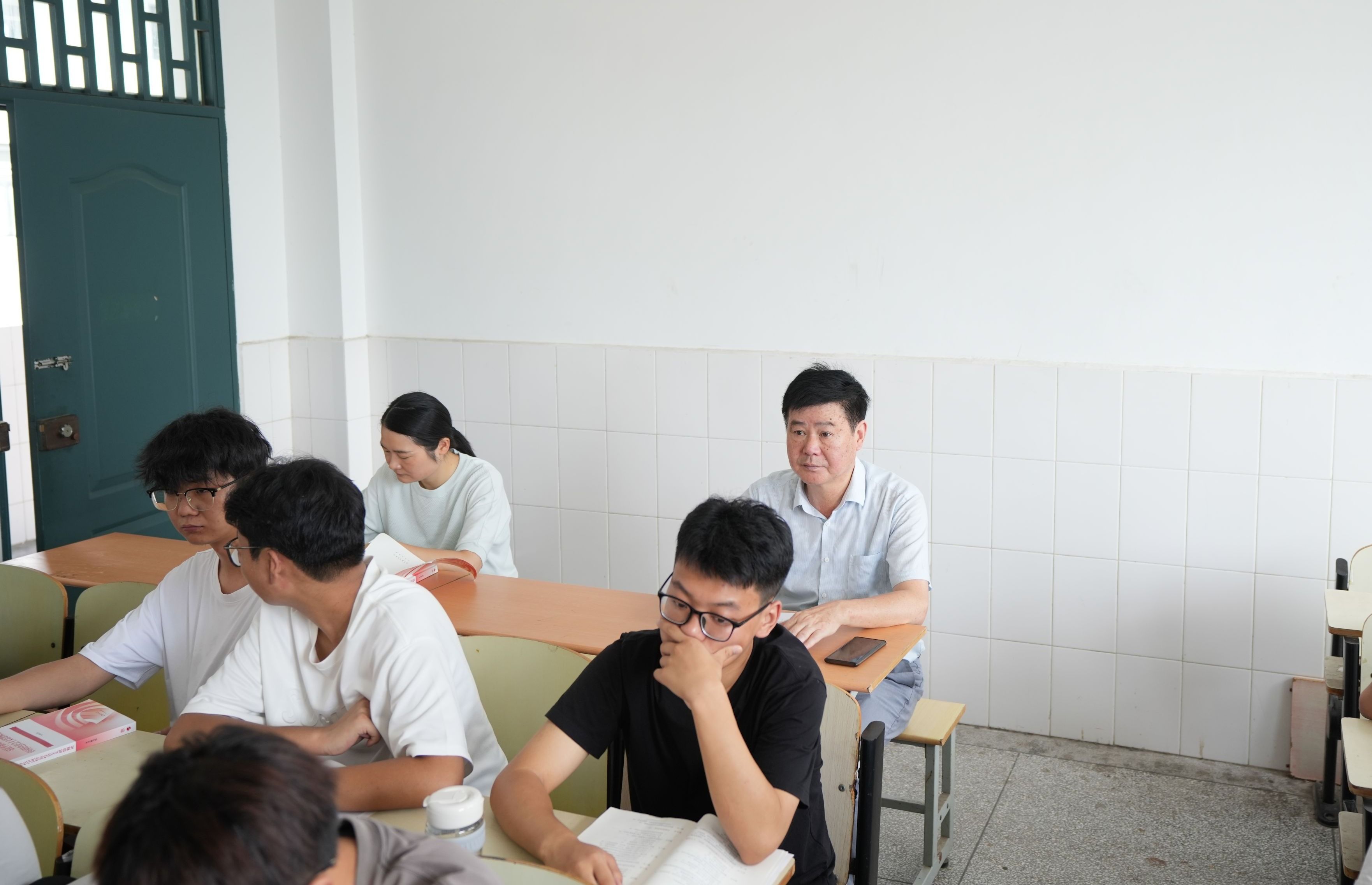 校党委书记余嗣元(后排右一)督查听课