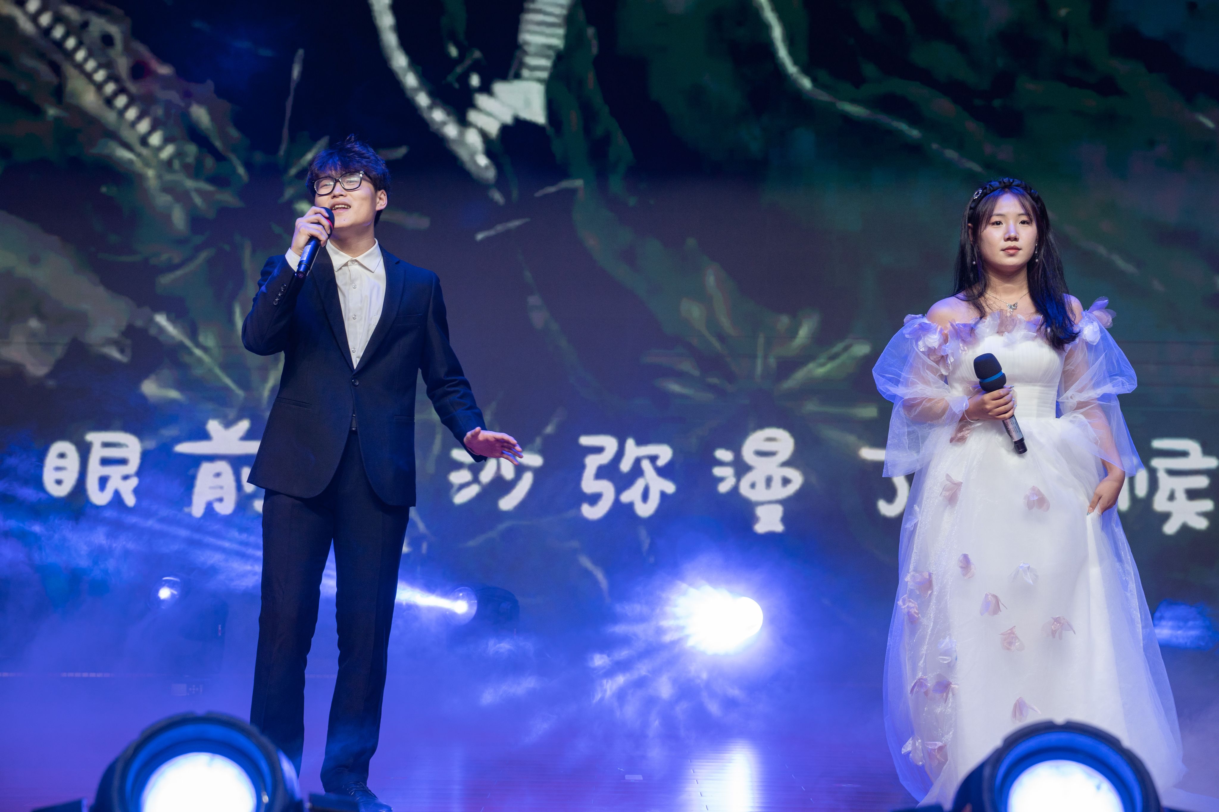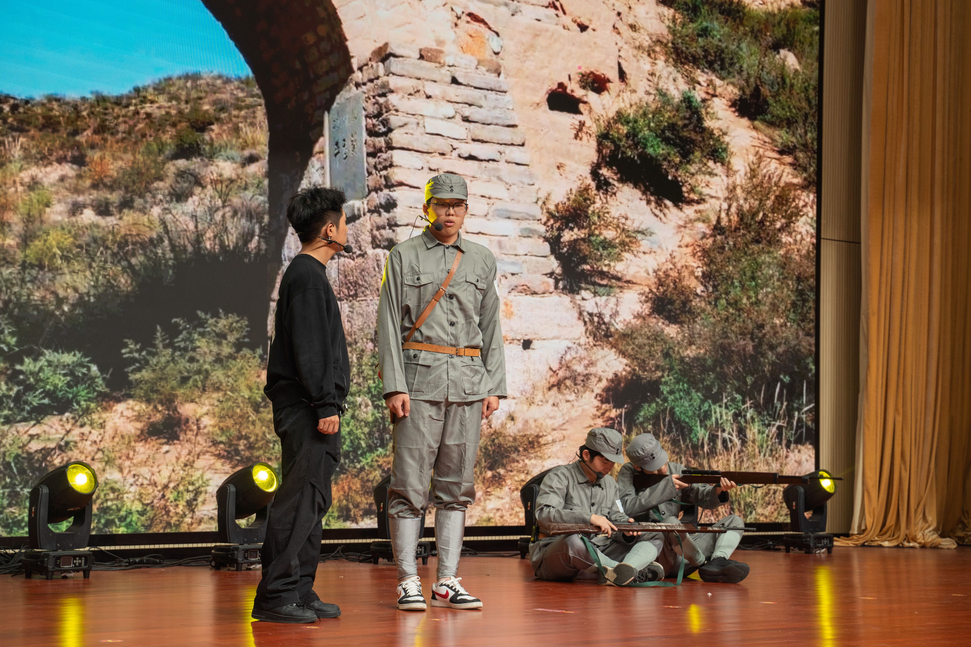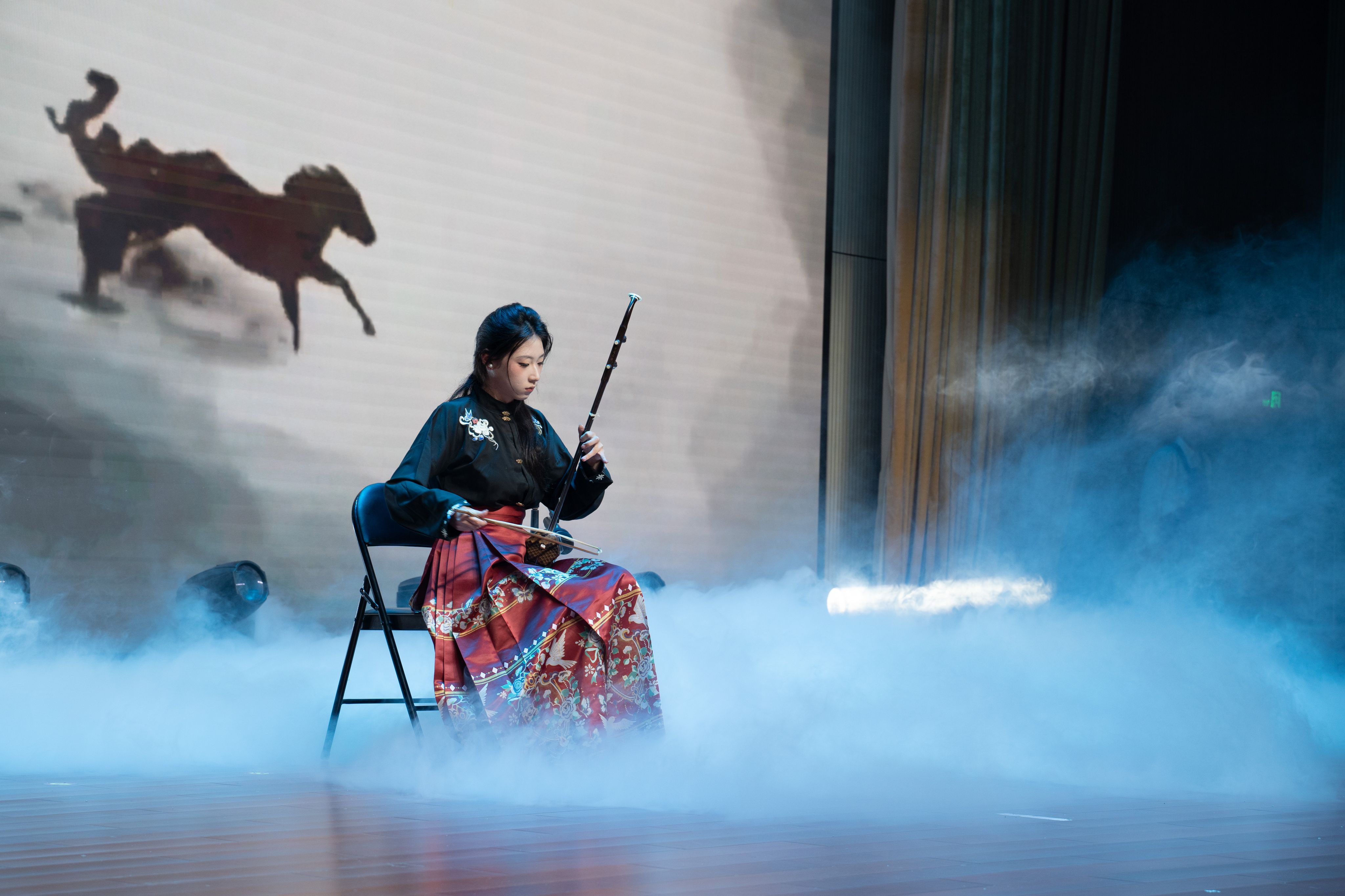 晚会节目共分为三个篇章,第一篇章“光辉岁月”。一群身着华丽服饰的舞者,手持色彩斑斓的龙鼓步入舞台中央,它将传统与现代完美融合,展现出无与伦比的视觉与听觉盛宴。乐器弹唱《沈园外》,乐手以轻柔的指弹技巧,勾勒出《沈园外》那悠扬而略带哀愁的旋律线条。二胡独奏《战马奔腾》,神情专注而激昂。随着她轻轻拉动弓弦,一曲《战马奔腾》骤然响起,瞬间点燃了整个空间的氛围,二胡的音色独特而富有穿透力,在学生的指尖下,它仿佛化作了千军万马,奔腾不息。歌舞《身骑白马》开口的瞬间,声音清澈而富有磁性,如同清晨的第一缕阳光,温柔地穿透心房。