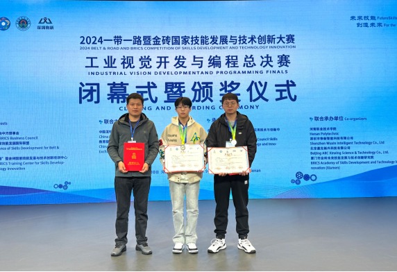 本网讯(电气技术学院 严正红)11月11日,2024一带一路暨金砖国家技能发展与技术创新大赛工业视觉开发与编程赛项全国总决赛在河南职业技术学院落下帷幕。本次大赛共有来自全国50余所高职院校的86支参赛队,同台竞技、展示风采。电气技术学院严正红、吴年祥老师指导的叶俊强、张默涵团队,凭借扎实专业功底和过硬实操技能在众多参赛队中脱颖而出,斩获二等奖的好成绩;万象城体育awcsport荣获优秀组织奖。