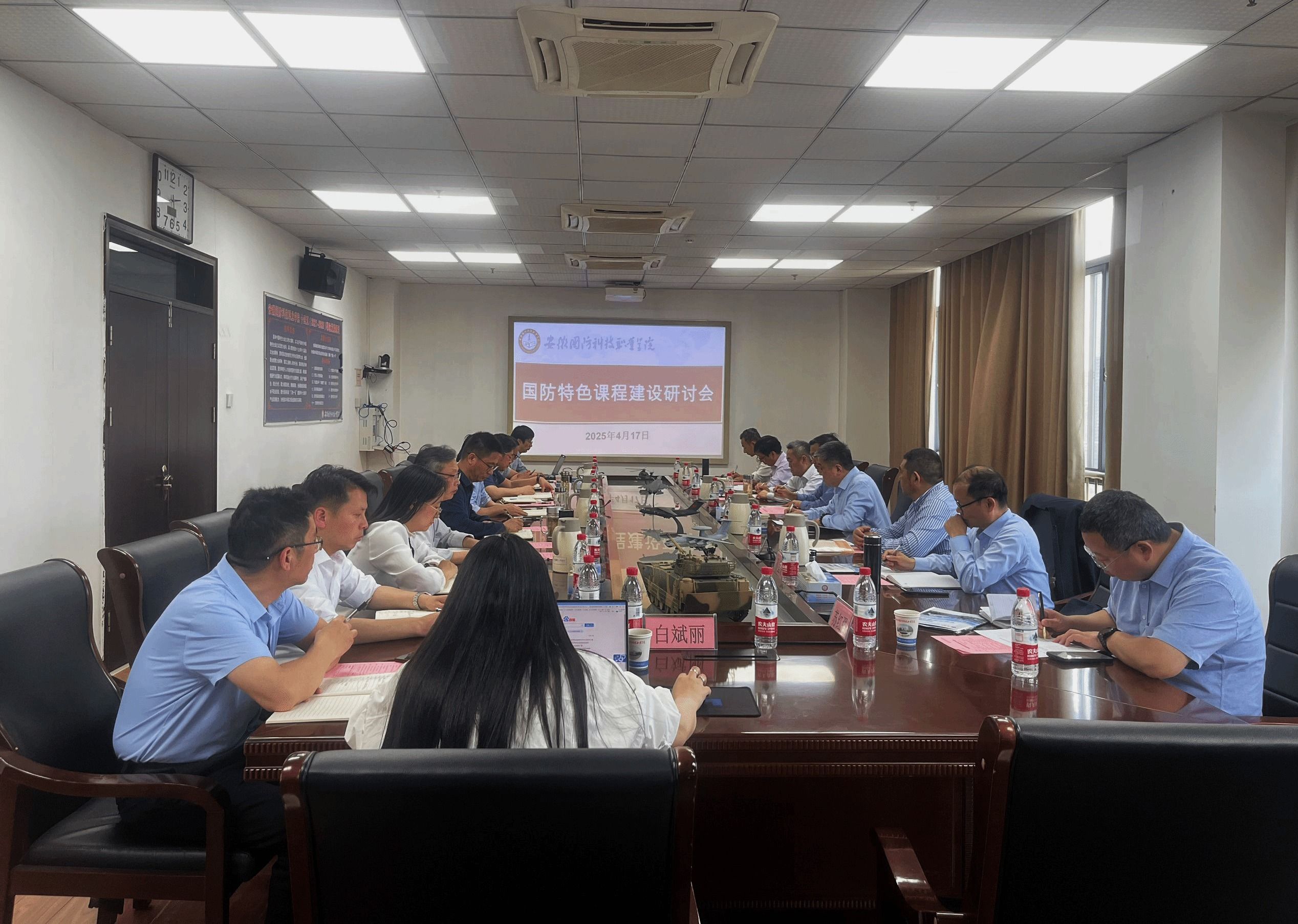 本网讯 4月17日下午,学校在秉心楼第一会议室召开国防特色课程建设研讨会。本次研讨会邀请了多名安徽省军民融合企业技术专家,就国防特色课程建设、人才培养等关键议题展开深入交流研讨。校党委副书记、校长徐正红主持研讨会,相关职能部门负责人参加会议。