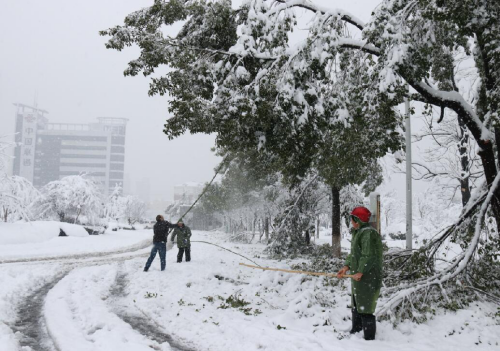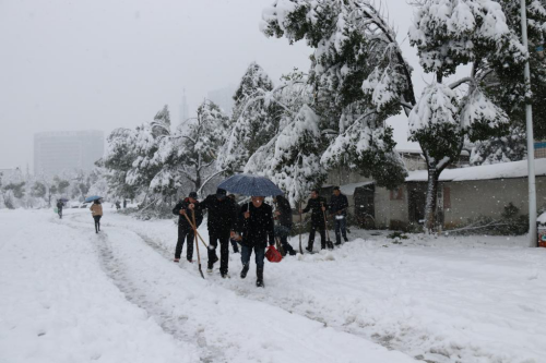 从3日夜里开始,学校相关部门就积极组织后勤和物业对校园绿化苗木进行除雪,同时清扫人行通道。