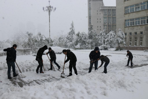 1月4日一早,学校领导和相关部门职工早早来到校园,利用铁锹、竹竿等工具在校园各处开展义务扫雪、除雪活动,为广大师生员工开辟安全通道,整个校园洋溢着劳动的热情和欢声笑语。