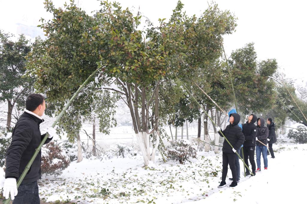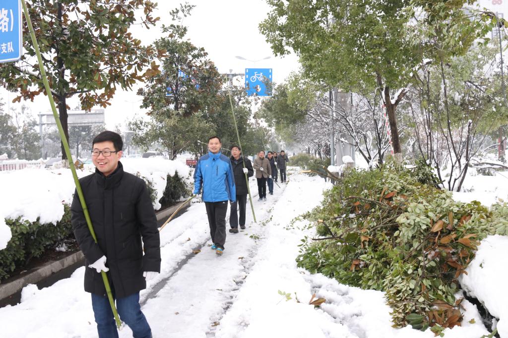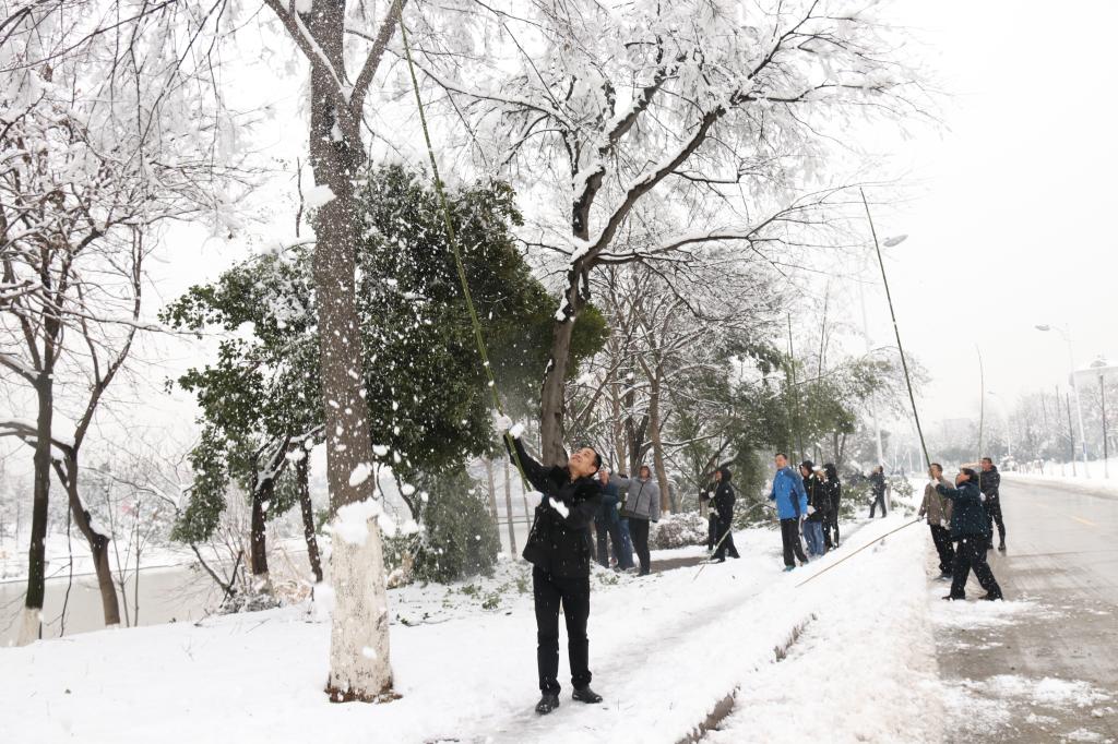 在包保路段,万象城官网党员干部在校党委委员、副校长冯伦久同志的带领下,用长竹竿将积在树顶端的雪敲打掉,以减轻树枝树叶负担,防止树枝折断,保障市民出行安全。同志们互相提醒互相帮助,干的热火朝天,一些同志热的脱下了厚厚的棉衣。经过一个多小时的努力,基本清理完道路两边景观树上的积雪。虽然累了点,但大家觉得为抗雪救灾工作作出贡献,尽到了一个党员干部、一个六安市民的责任和义务。