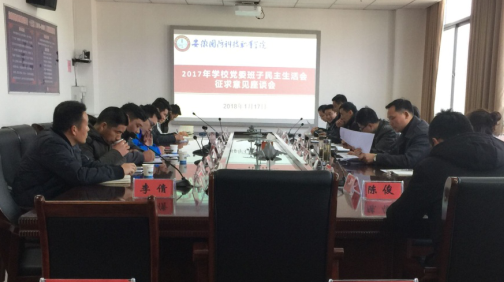 本网讯(党政办 徐敏)为确保2017年度学校党委班子民主生活会开出质量、取得实效,1月17日下午,万象城官网在综合楼第一会议室召开2017年学校党委班子民主生活会征求意见座谈会。校党委书记余嗣元出席会议,各单位、部门代表参加了会议。会议由校党委委员、党政办主任李存鹏主持。