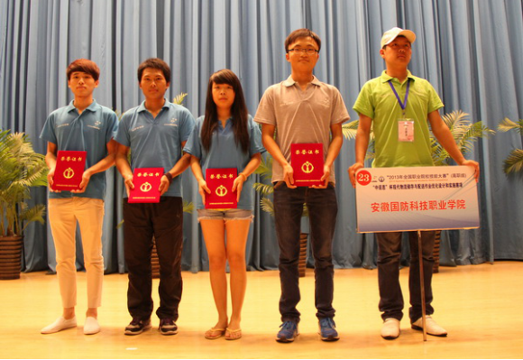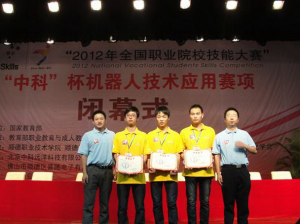 2012年,万象城官网学子获全国职业技能大赛“机器人技术应用”项目三等奖。上图为获奖学子与指导教师合影。