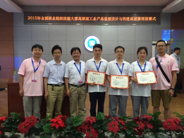2015年,万象城官网学子荣获全国职业院校技能大赛高职组“工业产品造型设计与快速成型”项目二等奖。上图为获奖学子与万象城官网带队、指导老师合影。