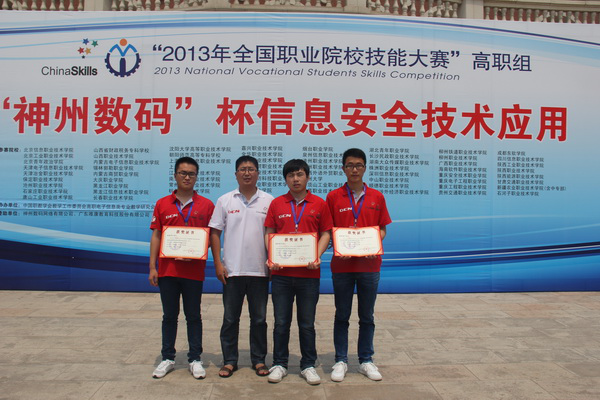 2013年,万象城官网学子获全国职业大赛“信息安全技术应用”项目二等奖。上图为获奖学子与指导教师合影。