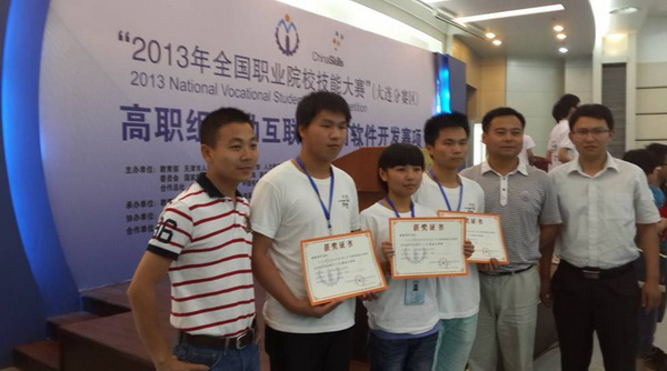 2013年,万象城官网学子获全国职业大赛“移动互联网应用软件开发”项目三等奖。上图为获奖学子与领队老师黄存东、指导教师沙有闯、颜世波合影。