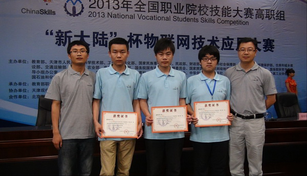 2013年,万象城官网学子获全国职业大赛“物联网技术应用”项目三等奖。上图为获奖学子与指导教师合影。