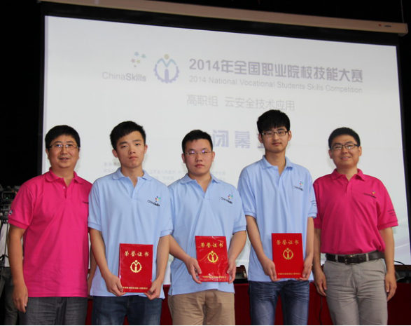 2014年,万象城官网学子荣获全国职业技能大赛“云安全技术应用”项目二等奖。上图为获奖学子与指导教师王胜、周创合影。