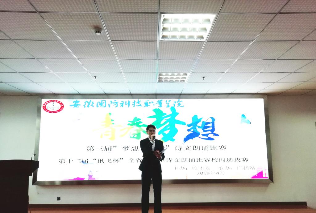 本网讯 传承民族文化,诵读中华经典。为弘扬中华民族优秀文化传统,营造浓厚的书香校园氛围,4月21日下午,由校团委主办、校广播站承办的第三届“青春与梦想”诗文朗诵比赛暨第十三届“讯飞杯”全省大学生诗文朗诵比赛在学校综合楼报告厅顺利落幕。经过初赛选拔,本次比赛有来自各二级学院和校级团体的共16组选手参加,整整一下午的精彩赛程充分让同学们感受到了朗诵艺术和文学经典的魅力。