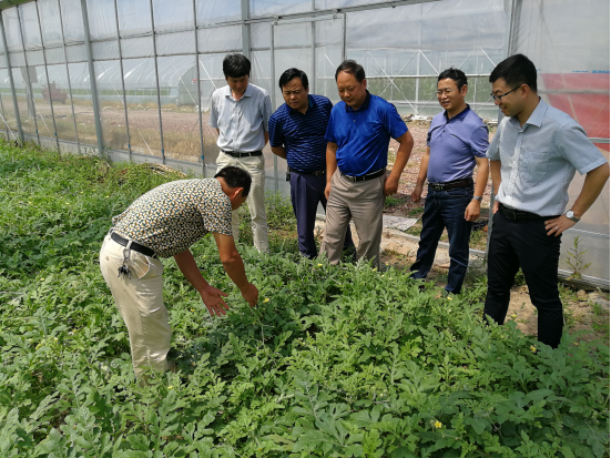 余嗣元(左一)查看太平村大棚蔬菜运营情况