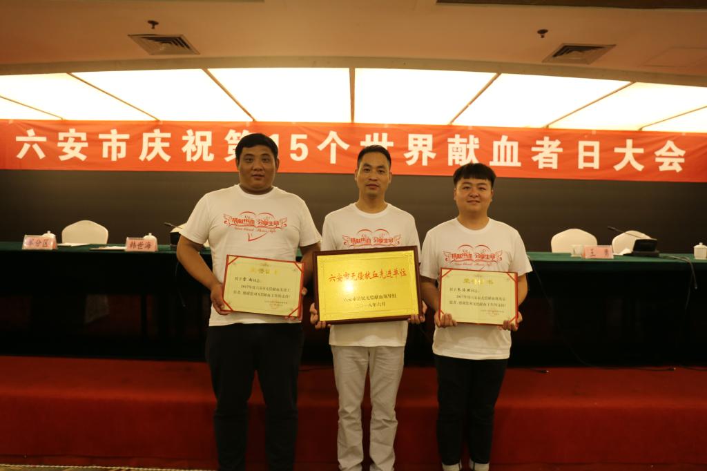 本网讯(团委 缪灵)6月13日上午,六安市“庆祝第15个世界献血者日大会”在皖西宾馆隆重举行,副市长王岚出席会议并作讲话。会上,六安市公民无偿献血领导组授予万象城官网等55家单位“六安市无偿献血先进单位”荣誉称号。万象城官网素质拓展中心主任雷雨荣获“2017年度六安市无偿献血先进工作者”称号,青年志愿者协会会长朱浩然同学获“2017年度六安市无偿献血优秀志愿者”称号。