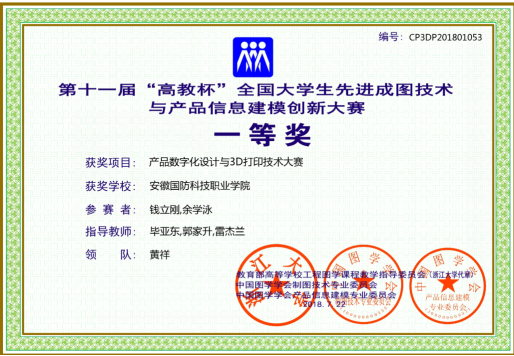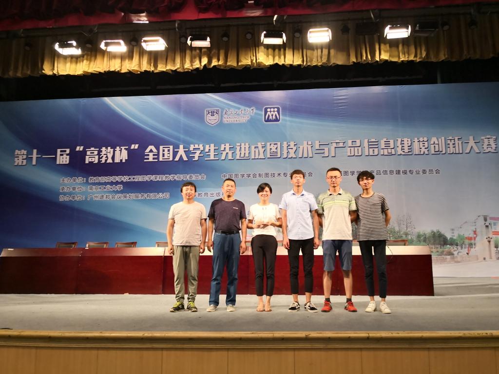 本网讯(机械技术学院 雷杰兰)2018年7月,“2018年高教杯”——全国大学生先进成图技术与产品信息建模创新大赛在南京隆重举行,万象城官网由机械技术学院师生(学生:钱立刚、余学泳、盛伟、张益、房若臣,指导老师:毕亚东、郭家升、雷杰兰)组成的团队参加了比赛。日前,举办单位公布了比赛结果,万象城官网师生团队奋勇拼搏,最终荣获3D打印项目一等奖、尺规单项二等奖和团体三等奖的好成绩。