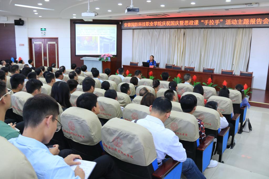 本次活动分两阶段进行:第一阶段以“庆祝国庆”主题报告会形式在校图书馆报告厅进行。校党委委员、副校长丁守宝首先致欢迎辞,代表学校向来宾的到来表示热烈欢迎,希望全体教师通过“手拉手”活动加强学习与交流,共同推动思政课教学质量再上新台阶。会上,皖西学院王俊老师以“中华人民共和国的诞生”为主题,详细解读了中国共产党从诞生之日起为新中国的成立所做出的伟大奋斗和牺牲,通过回顾中国共产党人的艰苦奋斗史、新中国国体、政体的诞生史,让大家一起回到了辉煌的建国年代。