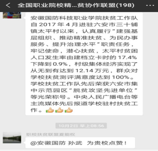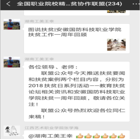 全国职业院校精准扶贫协作联盟微信群报道学校扶贫工作