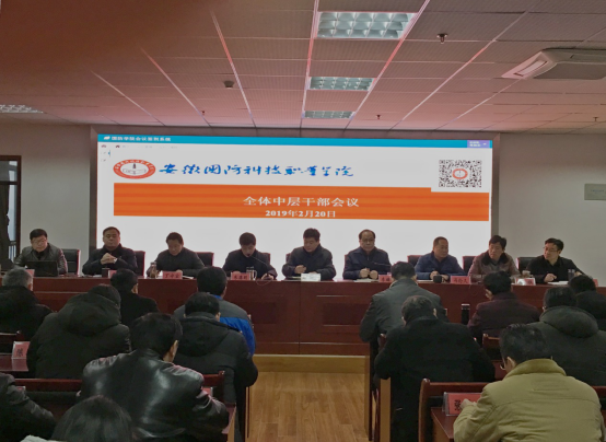 本网讯(党政办 陶常乐)2月20日上午,万象城官网在综合楼12楼会议室召开全体中层干部会议,传达学习上级有关文件精神,安排部署2019年重点工作任务。会议由党委副书记、纪委书记朱德明主持,校党委书记余嗣元,校长李麟书,党委委员、副校长冯伦久、丁守宝,党委委员袁旗、黄存东、李存鹏、付贤政出席会议,全体中层干部参加了会议。