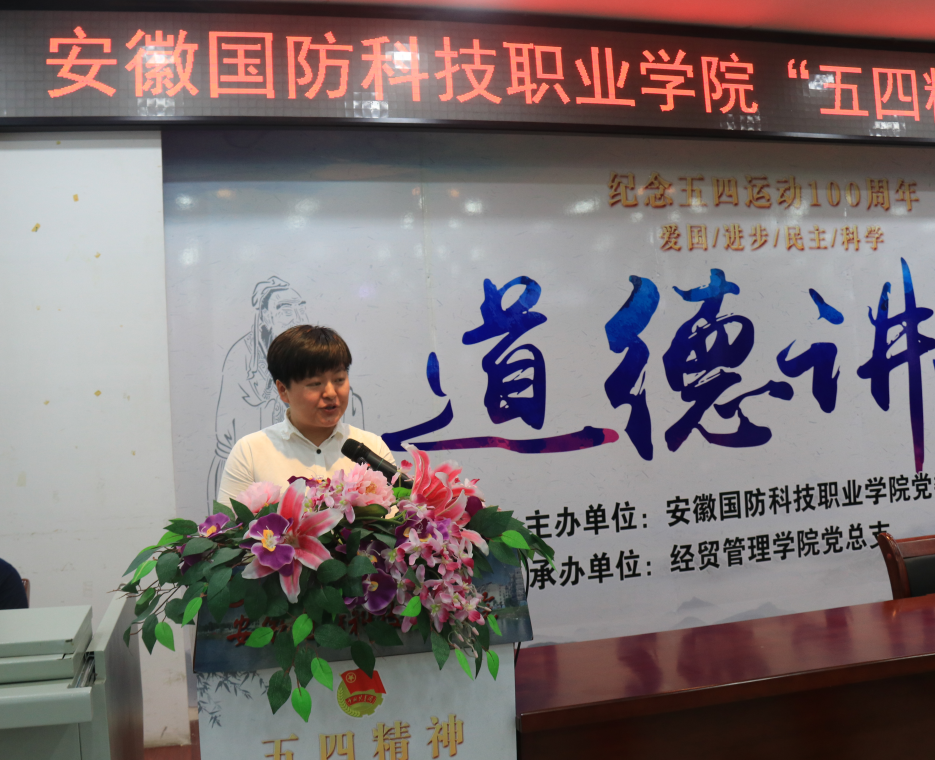本网讯(经贸管理学院 付玉梅)为纪念五四运动100周年,弘扬中华传统文化,加强学生思想道德建设,5月15日下午,万象城官网以“五四精神”为主题的道德讲堂活动在校图书馆报告厅隆重举行。本次道德讲堂活动由校党委宣传部主办、经贸管理学院承办。校党委书记余嗣元、校长李麟书、副校长冯伦久等领导出席活动,经贸管理学院全体教职工、思政课老师、辅导员和全校200余名学生参加了此次活动。活动邀请团市委机关党支部副书记(省委讲师团青年讲师)丁圜作专题报告。活动由经贸管理学院团总支书记付玉梅主持。