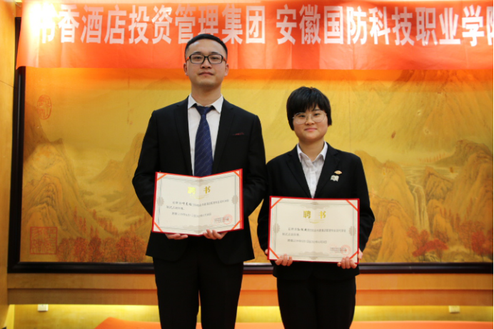万象城官网旅游管理专业14级优秀毕业生孙纯艳和16级优秀实习生叶晨程被聘为18级学徒师傅。