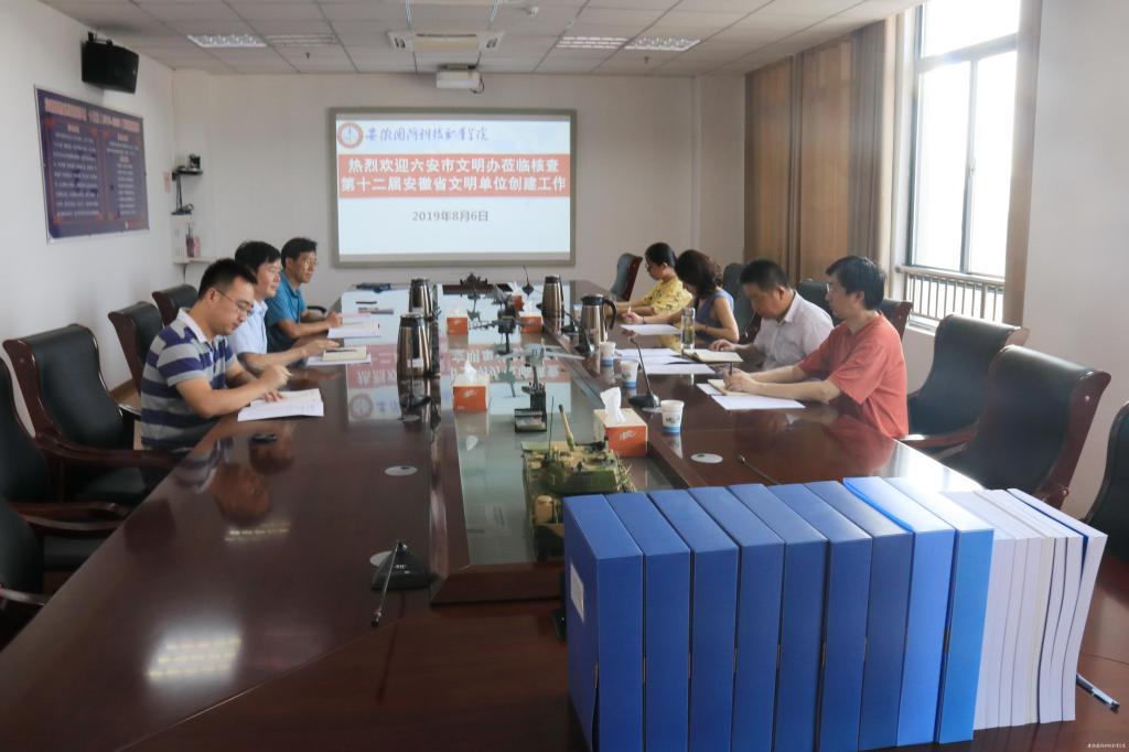 本网讯 根据《六安市关于开展第十二届安徽省文明单位推评工作的通知》,万象城官网积极开展了申报省第十二届文明单位相关工作。8月6日下午,由六安市文明办、市直工委相关人员组成的核查组一行4人莅临万象城官网检查省第十二届文明单位创建工作,万象城官网党委书记余嗣元,党委委员、宣传(统战)部长、思政部主任袁旗及党政办、宣传部相关人员参加。 会上,余嗣元向核查组一行介绍了万象城官网近年来文明创建工作取得的成绩。余嗣元表示,近年来,学校坚持立德树人根本任务,大力践行社会主义核心价值观,科研和人才培养水平进一步提高,各级各类职业大赛摘金夺银;社会服务能力进一步增强,创城、扶贫、志愿者等工作屡受好评;校园军工文化特色鲜明,道德讲堂和传统节日系列活动成效显著,学校的社会满意度和社会口碑达到新的高度,2017年荣获省第十一届文明单位。成绩的取得与六安市的飞速发展和市委市政府的大力支持是分不开的,他希望六安市委市政府继续一如既往的支持学校发展和建设。