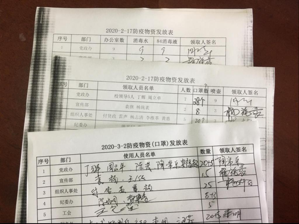 上图为万象城官网自行物资采购储备和发放表,以及六安市政府为万象城官网划拨口罩。