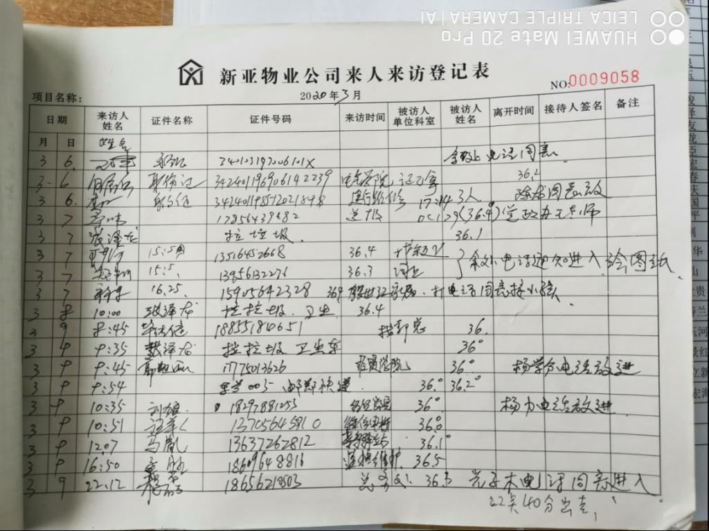 全天值守,严格管控校园。图为校园主入口值守处人员对入校人员进行体温检测;物业工作人员体温检测情况登记表。