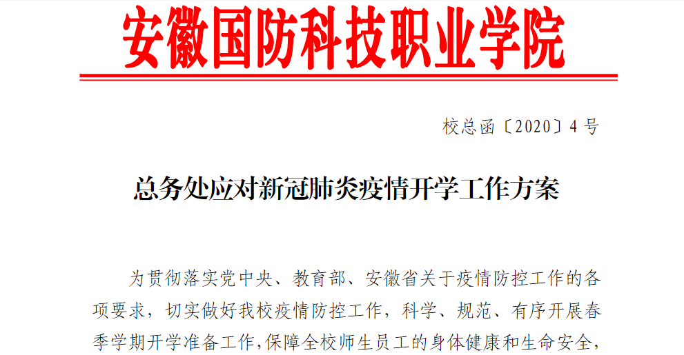 医疗卫生组按照工作部署,充分利用信息化方式如官微、网站等方式,向广大师生做好“新冠”病毒知识的普及工作,以及如何预防等措施,及时最好国家卫健委关于防疫措施的新版方案,与学校其他部门及时沟通协作,做好心理疏导,在关注卫生防疫的同时,注重学院师生的心理健康。同时根据学校实际制定了垃圾处理、学院卫生、消毒清扫等预案,做到了疫情防控有抓手,后勤医疗有保障。卫生科与六安市金安区第四人民医院,按照方案要求,制定了相应预案,为校园出现突发情况做好医疗保障的准备,同时,利用校园信息系统做好疫情期间的卫生宣传工作,及时向师生传达疫情期间如何正确使用口罩,合理膳食等公共卫生知识。