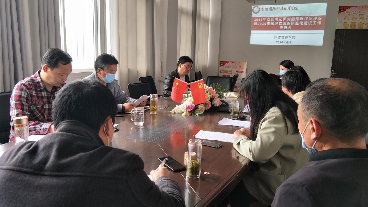 本网讯(经贸管理学院 张圣霞)为了加强党支部标准化、规范化建设,充分发挥基层党组织的战斗堡垒作用和党员的先锋模范作用,4月23日下午,经贸管理学院党总支在知行楼204会议室召开落实“对标争先”建设方案,推动基层党组织标准化建设更上一层楼学习活动。学习活动由党总支书记杜先扬主持,党总支班子成员、各支部委员会成员、党员和群众代表共12人参加了会议。