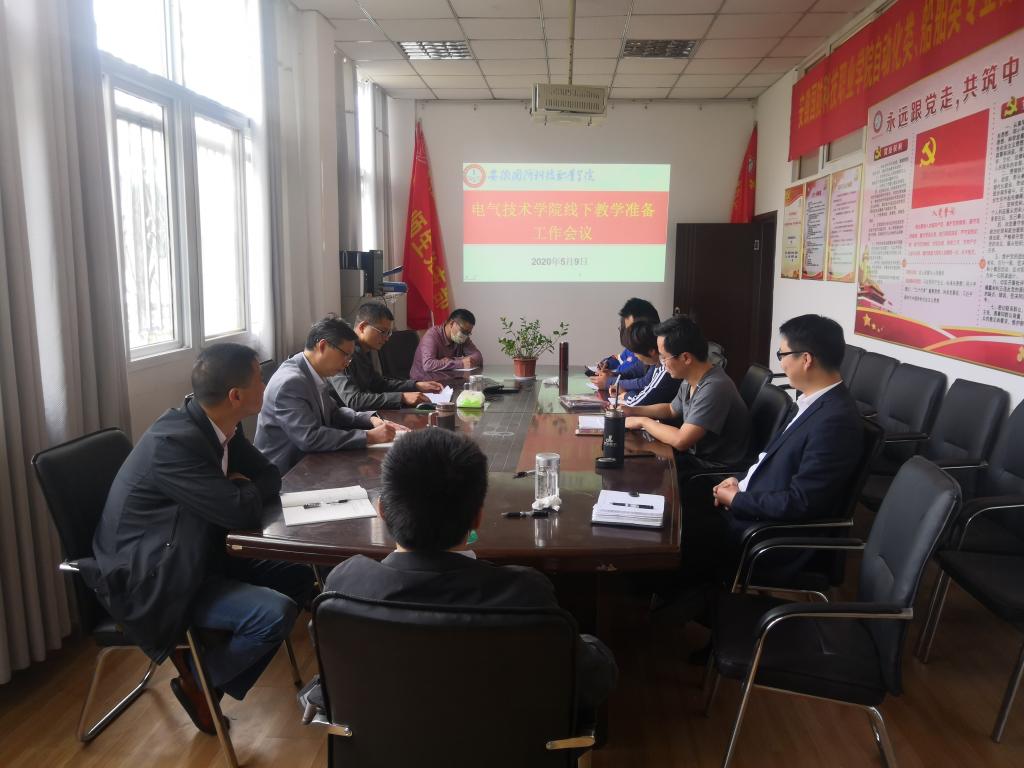 本网讯(电气技术学院 史媛芳)依据学校《关于2020年春季学期学生返校安排的通知》及《关于2020年春季学期教职工返校安排的通知》等文件精神,学生及教职工即将分批次返校,为积极做好学生返校后各项准备工作,5月9上午8点30分,电气技术学院召开线下教学准备工作专题会议,会议由院长李翔主持,所有教学行政坐班人员、实训室管理教师参会。