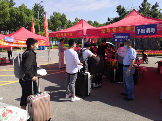 在学生返校报到现场,学院严格执行学校学生返校工作方案相关要求,配合学校有关职能部门,按照“安全第一、分时错峰、联防联控”的原则,筑起学生入校的安全防线。在经贸管理学院学生入校登记处,同学们佩戴口罩、间隔排队,在完成手部消毒、身份核实、上交承诺书、查验安康码、发放防疫物资、领取宿舍出入证后,在工作人员的指引下走专用通道安全进入校园。