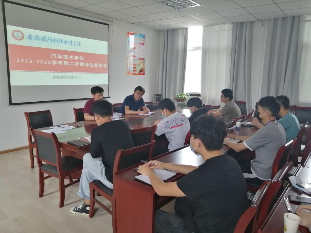 本网讯(汽车技术学院 黄世超)为充分了解学院实际教学状况,提升教育教学质量,培育优良学风和严谨教风,营造积极向上的教学氛围和学习氛围,6月17日下午,汽车技术学院在知行楼416会议室召开2019-2020学年第二学期师生座谈会,学院副书记余桂刚老师、副院长姜继文老师、辅导员黄世超老师、第一批返校学生干部代表参加了本次座谈会,座谈会由姜继文老师主持。