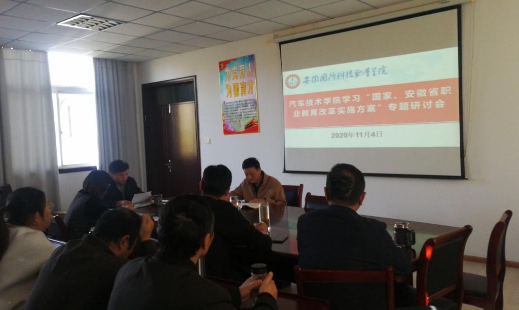 本网讯 为进一步加深对《国家职业教育改革实施方案》(简称国家“职教20条”)和《安徽省职业教育改革实施方案》(简称安徽“职教18条”)的学习理解,推动《国家职业教育改革实施方案》和《安徽省职业教育改革实施方案》在学院日常工作中的扎根落地,切实指导学院教育教学管理等各项工作,11月4日下午,汽车技术学院组织召开了《国家职业教育改革实施方案》和《安徽省职业教育改革实施方案》学习研讨会,汽车技术学院院长黄道业教授带领全体教职工学习了两个《方案》文件,并对两个《方案》进行了解读。