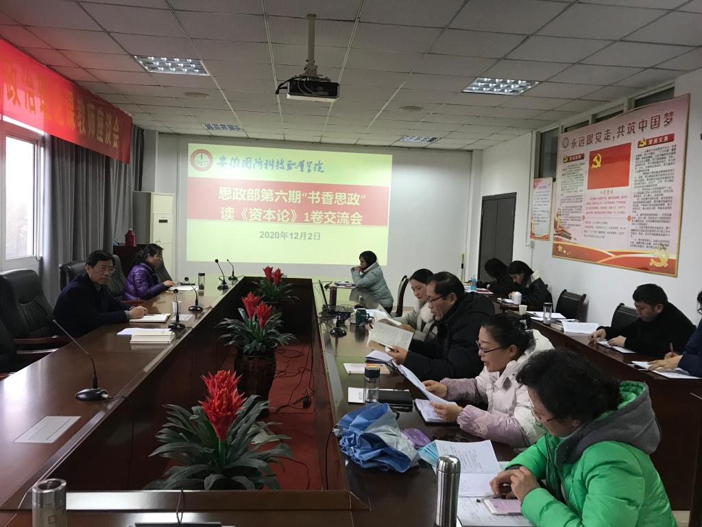本网讯 为进一步学习贯彻习近平新时代中国特色社会主义思想,贯彻落实习近平总书记在学校思想政治理论课教师座谈会上的重要讲话精神,切实建设好“质量思政、书香思政、温馨思政”,提高思政课教师理论水平,提升思政课的思想性和理论性,思政部第六期“书香思政”读书活动,即“读《资本论I卷》交流会”于12月2日下午在知行楼403会议室举行。校党委委员、宣传部长、思政部主任袁旗出席并主持会议,思政部全体专兼职教师参加。