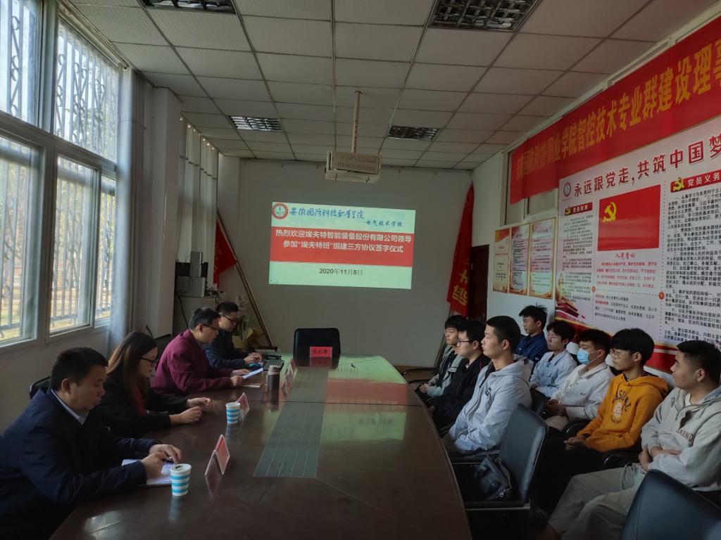 随后,埃夫特智能装备股份有限公司教育总监陈适代表企业讲话。她首先对“埃夫特订单班”顺利开班向学校表示感谢,并介绍了埃夫特智能装备股份有限公司的人才战略,表达了对校企合作培养企业应用技能型人才的热切期待。希望同学们在校期间努力学习,扎实学好专业知识。随后就同学们所关心的问题,与同学们进行沟通交流。