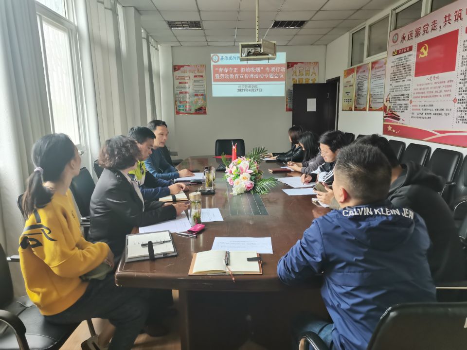 本网讯(经贸管理学院 许凤麟)为进一步加强学校大学生思想政治教育工作,促进学生全面发展,提高学校人才培养质量,根据学校工作部署,4月27日下午,经贸管理学院召开了“青春守正 拒绝吸烟”专项行动暨劳动教育宣传周专题会议,党总支书记杜先扬及全体辅导员、班主任参加,会议由副书记刘峰主持。