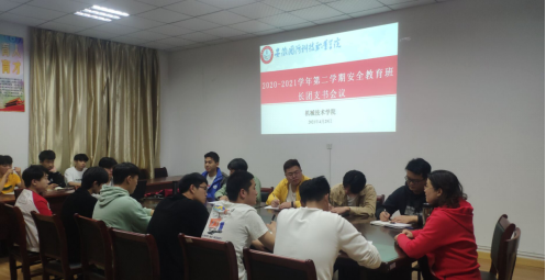 4月29日下午,机械技术学院党总支副书记陈思及团总支王洋老师组织召开本学期安全教育班长、团支书会议,向与会19级、20级各班学生干部宣讲安全知识,交流班级安全工作情况,就“五一”前后班级安全工作要点提出指导意见。