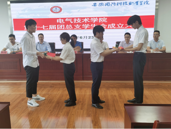 纪远和王腾州老师分别宣读《电气技术学院第十七届学生会干部任命的通知》和《电气技术学院第十七届团总支干部任命的通知》,与会领导老师向新聘任的第十七届团总支学生会干部颁发聘书。