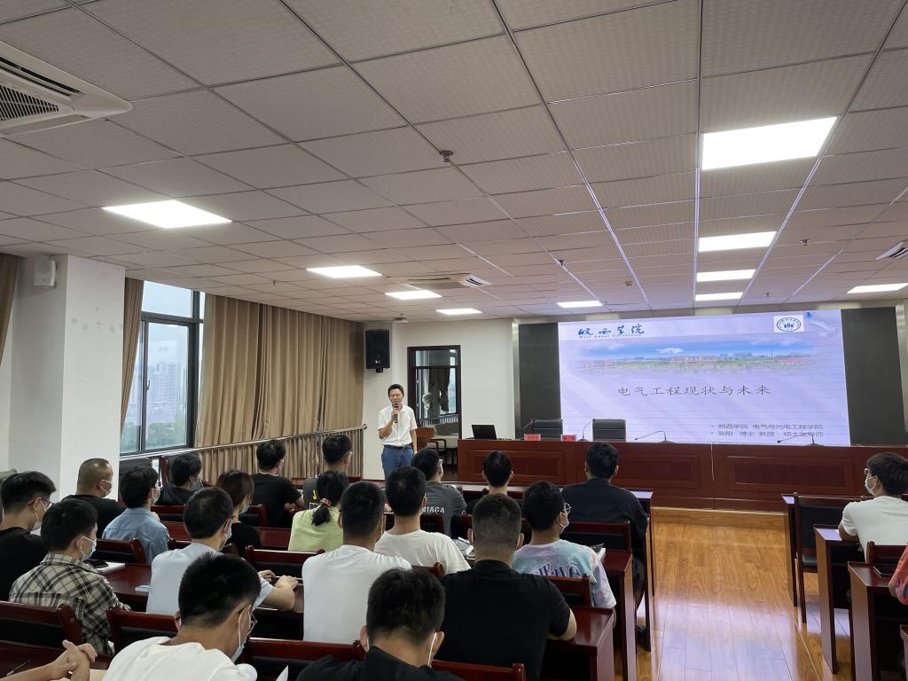 本网讯(电气技术学院 侯国栋)电气技术学院与皖西学院自2020年开展电气工程及自动化专业专升本学生联合培养,2021年联合培养该专业新生规模已达103人。为加深同学们对电气工程及其自动化专业的了解,激发学习兴趣,电气技术学院计划组织开展电气工程及其自动化专业的专业导论系列讲座活动。9月6日下午5点,电气技术学院邀请皖西学院电气与光电工程学院院长张刚教授,为2021级电气工程及自动化专业本科班新生举办了系列讲座的第一场讲座——“电气工程现状与未来”主题讲座。