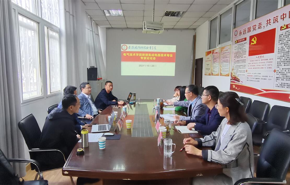 通过学院党政联席会议讨论通过、学院内部研讨会之后,10月28日,电气技术学院邀请了皖西学院电气与光电工程学院张刚教授、杭州朗讯科技有限公司郭志勇教授等校外专家对新增专业的市场人才需求、办学基础、培养目标与职业面向等方面进行论证。江主任从专业申报理由、专业基本情况、专业人才需求情况、专业师资队伍、人才培养方案、课程建设、教学条件等方面向专家组汇报。专家组认真审核了《新增集成电路技术专业申报书》、《集成电路专业人才培养方案》等材料,并从区域经济发展、人才培养定位、专业特色打造、核心课程设置等方面提出了修改意见。