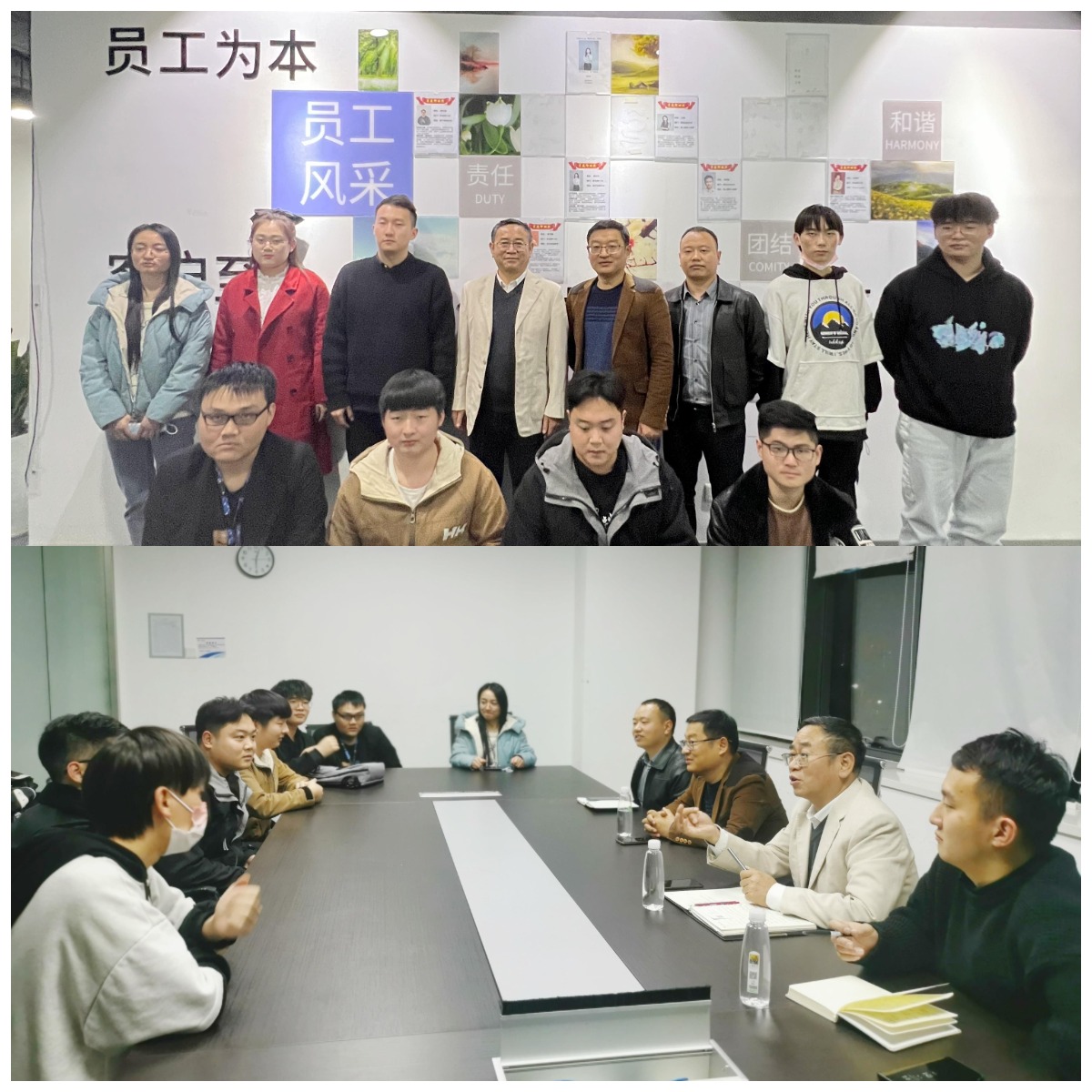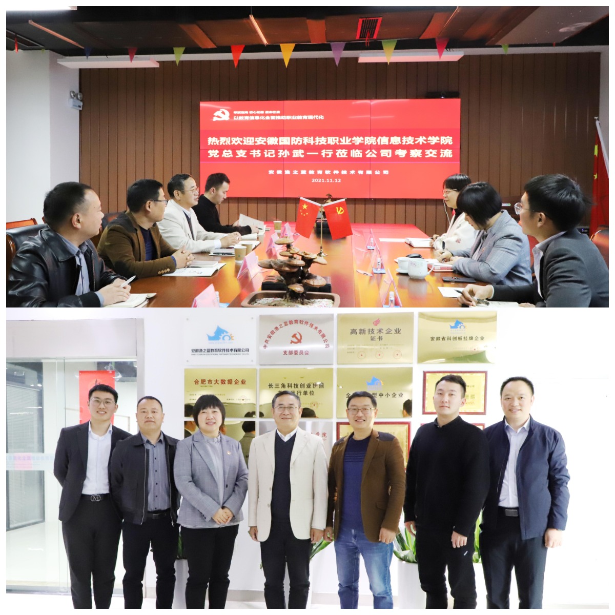 孙武书记一行第一站来到安徽渔之蓝教育技术有限公司,与公司总经理、党支部书记李媛媛等,就学生培养,加强校企合作以及党建工作展开了深入交流。在听取公司领导和万象城官网毕业生程绍玉的汇报之后,孙武书记强调,一是要加强校企之间的沟通交流,为学生由学校向工作岗位的转变提供最大的帮助;二是要提高学生们政治理论水平,不断提高思想政治站位,以公司党建推动团队的建设;三是同学们要不断提高自己的专业知识水平和实践动手能力,以便于在技术不断发展革新的职场上奋发向上,创出自己的“一片天地”。