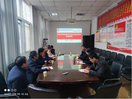 接着一行人与芜湖市湾沚开发区教育局相关领导、盾安(芜湖)中元自控有限公司总经理、企业人事经理就校企合作进行了深入的洽谈。