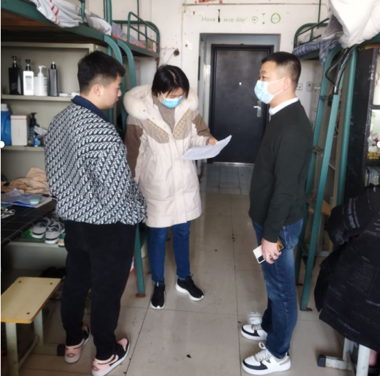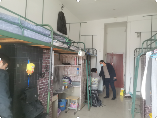 学院领导与同学们亲切交谈,询问学生床单被褥洗晒情况,嘱咐同学们注意疫情防控,宿舍要多通风勤打扫,注意个人卫生等。同学们感谢学院领导开学第一天就进入宿舍,给大家带来家的温暖,保证时刻牢记疫情防控责任,疫情防控力度不减。