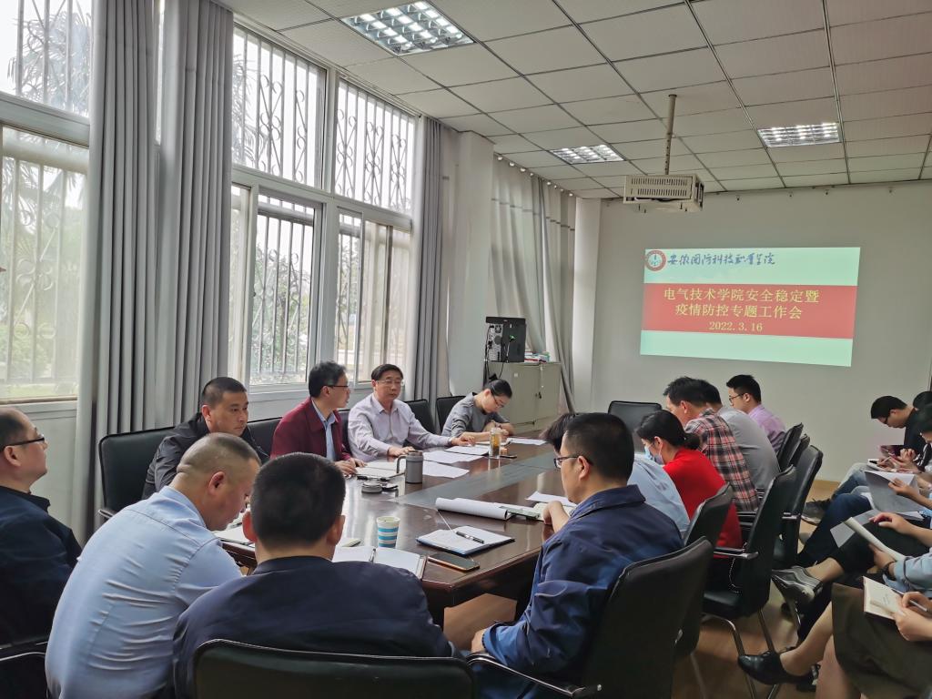 本网讯(电气技术学院 程坤)3月16日下午,电气技术学院安全稳定暨疫情防控专题工作会在电气技术会议室召开,电气技术学院党总支书记叶启衡主持会议,电气技术学院全体教职工参加本次会议。