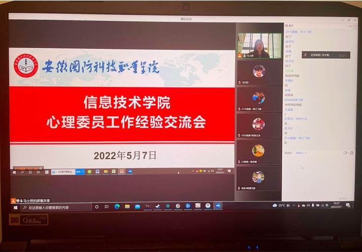 本网讯(信息技术学院 马士君)为进一步促进心理委员间的交流与学习,引导心理委员在做好自身心理调节的同时,更好地开展班级心理健康工作,帮助其他同学做好疫情期间的心理调适和情绪解压,5月7日上午,信息技术学院召开了线上心理委员工作经验交流会。20、21级共41个班级的心理委员参加了会议,会议由学院心理辅导员马士君老师主持。