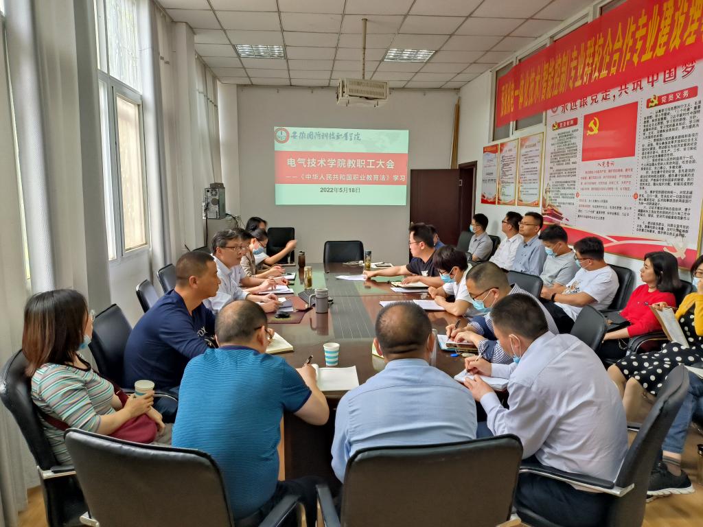 本网讯(电气技术学院 程坤)为进一步提升电气技术学院教职员工的职业素养,5月18日下午,电气技术学院组织部门全体教职员工在知行楼106会议室集体学习了新修订的《中华人民共和国职业教育法》,本次学习由电气技术学院院长李翔领学。