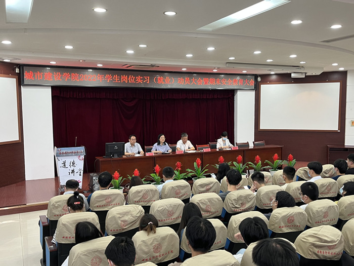 本网讯(城市建设学院 王俊)为做好2022年学生岗位实习工作,6月1日,城市建设学院在学校图书馆报告厅召开2022年岗位实习(就业)动员大会暨期末安全教育大会,城市建设学院院长王红林、党总支副书记叶高洁、副院长左飞、辅导员、专业课教师及全体2023届毕业班班主任、毕业生参与会议,会议由党总支书记张宗江主持。