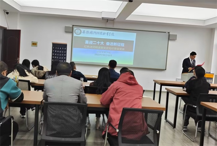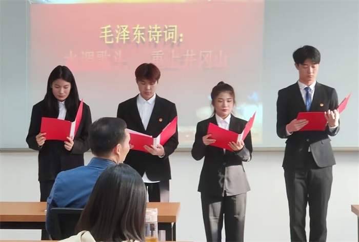 本网讯(经贸管理学院 张圣霞)为弘扬中华文化,传承红色基因,喜迎党的二十大胜利召开,10月12日下午,经贸管理学院党总支在实训楼403室举办“喜迎二十大 奋进新征程”红色诗词朗诵暨党史知识竞答活动,全体党员及入党积极分子参加。