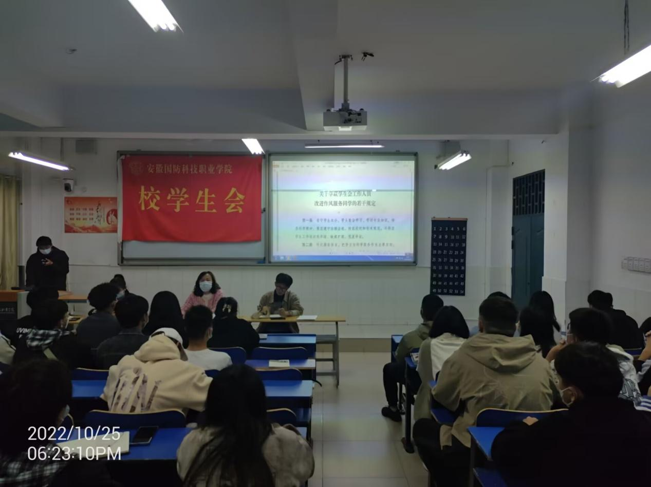 会上,在张凤带领下,全体学生干部认真学习了《关于推动高校学生(研究生会)深化改革的若干意见》、《关于学联学生会工作人员改进作风服务同学的若干规定》和《加强和改进新时代学联学生会工作实施方案》。她指出,各级学生组织是全体同学的群众组织,是学校落实立德树人根本任务的重要力量,通过开展各项活动提升学生素质、引导同学构建和谐校风,旨在服务学校改革发展、服务学生成长成才的学生组织,而作为学生干部不仅要牢记服务宗旨,不得以同学“官”自居,更要以身作则,起到表率作用。