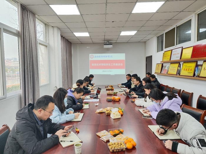 本网讯(信息技术学院 严晓曼)为认真贯彻落实学校关于2023年春季学期开学的决策部署,2月9日下午,信息技术学院在知行楼304会议室召开期初班主任工作会议,参加会议的有院党总支副书记杨庆颖,各年级辅导员及全体班主任。会议由院党总支副书记杨庆颖主持。