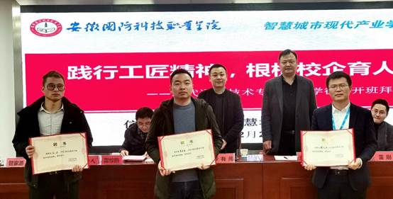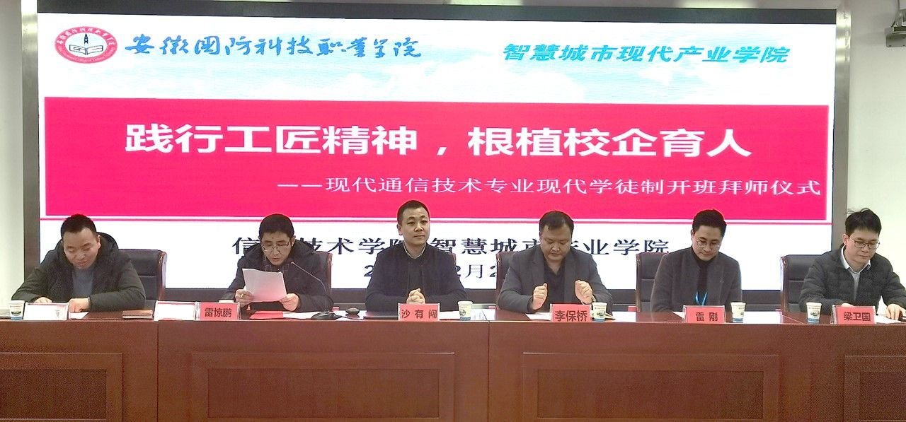 本网讯(信息技术学院 王干) 德艺育桃李,名师出高徒。为进一步深化产教融合,优化人才培养模式,推动“双高”专业群建设,2月22日下午,信息技术学院——智慧城市产业学院现代通信技术专业“现代学徒制开班暨双导师制拜师仪式”在秉心楼12楼隆重举行。校党委委员、信息技术学院院长沙有闯、教育谷投资控股有限公司、中鸣瑞创教育科技有限公司副总经理李保桥,中兴通讯(南京)有限责任公司、南京顺盛通信科技有限责任公司合肥分公司、浙江省邮电工程建设有限公司安徽分公司的领导与师傅代表,校内专业导师蔡正保、王干、任鸿哲以及2022级现代通信技术专业的140余名学子出席本次仪式。仪式由信息技术学院副院长雷惊鹏主持。